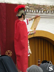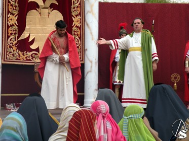 Las 17:30 están a punto de dar, llegan unos tambores de la banda municipal de Burguillos “Ntra. Sra. Del Valle”, llega la comitiva a la entrada del pueblo, dónde las hermanas misioneras junto con los actores y con la ayuda del ayuntamiento de Alcalá del Río, han preparado en dos escenarios el palacio de Poncio Pilatos y en el otro el consejo del Sanedrín, que por cierto no le faltan detalle alguno, sus columnas, cortinas, mesas, sillas, estrella de David…, aparece en escena Pilatos que en la vida real es policía local, y que se da la circunstancia que Claudia la mujer de Pilatos, también es la mujer de Francisco que es quien encarna a Pilatos, es ama de casa.