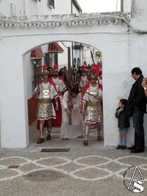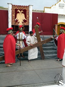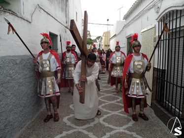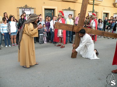Después de algunos intentos del Centurión Romano Cayo, encarnado en Juan que actualmente está desempleado, y de la mujer de Pilatos Claudia, para salvar a Jesús, después de mandarlo azotar por los soldados romanos encarnados en Álvaro, Joaquín, Baldomero, Manuel y Francisco, que se da la circunstancia como pasó en la película de la Pasión de Cristo de Mel Gibson, varios latigazos se le escaparon y se lo dieron de verdad. Pero Pilatos al ver al pueblo revuelto, y al estar manipulando cuando uno de ellos le dijo a Caifás: “llego la hora decisiva”, y que en la vida real es Alonso y es herrero de profesión, le dicen a todo el pueblo que lo crucifiquen. En el pueblo están personas de todas las edades con sus trajes de hebreos de la época y lo forman unas 30 personas. Jesucristo carga con la cruz, y la cruz es una señora cruz de unos tres metros, que la besa Jesucristo, camino del calvario concretamente en la calle S. Ignacio a la entrada del pueblo, Jesús cae por primera vez.