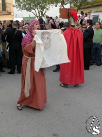 Seguimos camino del Calvario, dejando el callejón del Agua y nos dirigimos ahora a la Ronda de las Escuelas. Nos encontramos con la escena de la Verónica, encarnada en el papel de Ana, ama de casa, que le limpia el rostro a Cristo, y que en la vida real es el novio de su hija, que con su prima hacen de esclavas de Claudia en la Pasión de Cristo. Llegamos a la tercera caída de Jesucristo, aquí se da la circunstancia que un fotógrafo venido para el evento quiere levantar a Cristo, pero con la mirada del soldado romano bastó para desistir de su intento. Jesucristo se encuentra con las mujeres que están llorando, les dice Jesucristo que no lloren por Él, sino más bien por sus hijos, lo que hoy también les diría Jesucristo a muchas madres.