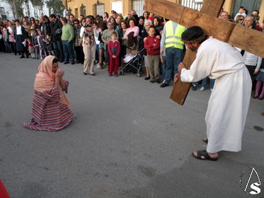 En este punto del recorrido nos encontramos con una de las escenas más emotivas de la escenificación, cuando la Virgen María, que en la vida real es Mercedes, ama de casa, madre de tres niños y mujer de uno de los soldados romanos, se encuentra con Jesús después de pedírselo S. Juan, que es Ramón Agricultor de profesión y se da la circunstancia que Mª Magdalena, es Concha mujer de Ramón, ama de casa, madre de dos niños, su hija Lucía también hacía de pueblo. El papel de la Virgen María en esta escena es impresionante, muchas personas de las que asistimos se nos saltaron las lágrimas en esta escena. Seguimos camino del Calvario por la calle S. Ignacio y nos metemos en el Callejón del Agua.